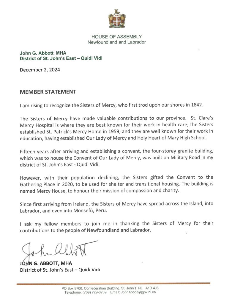 Minister John Abbott, MHA for St. John’s East-Quidi Vidi and N.L. Housing Minister, stood in the House of Assembly on December 2, 2024 to recognize the Sisters of Mercy for their valuable contributions to the province of Newfoundland and Labrador since 1842.
